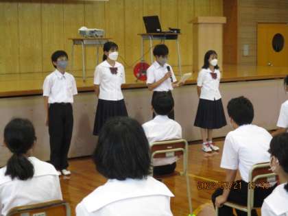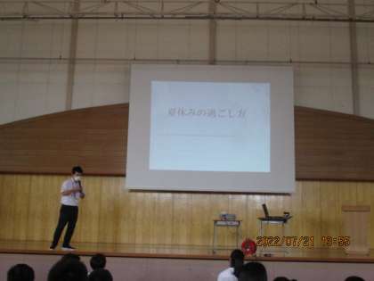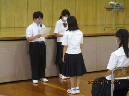 学級代表から1学期の振り返り、学年生徒会から学級MVPの表彰を行いました。そして、牧田先生、頼成先生から夏休みの学習、生活についての話がありました。37日間、充実した夏休みを過ごしてほしいと思います。