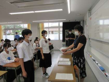 2学年集会では、班長による1学期の振り返り、学級MVPの表彰、先生方から夏休みの過ごし方等についてのお話がありました。