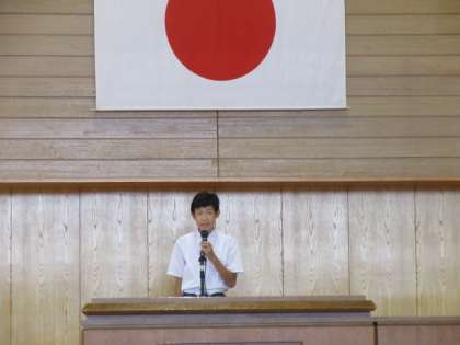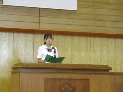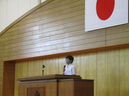 各学年の代表者が意見発表しました。学級代表として、体育大会のリーダーとして、社会に学ぶ「14歳の挑戦」を通して学んだことや、進路選択を目前に決意を新たに夏休みを迎えることなど、それぞれの思いをそれぞれの言葉で発表しました。