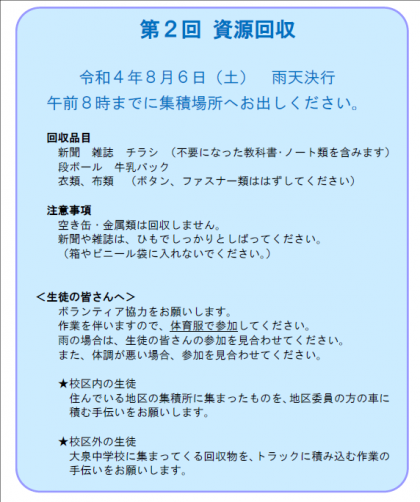 今回は、学校での回収と合わせ、各地区での回収を行います。