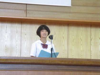 1年代表は、夏休みに参加した起業家マインド育成塾において、経済のしくみや起業家の話を聞くことで、様々なことにチャレンジしていこうという思いを新たに、学校生活を一生懸命取り組もうと決意を語りました。