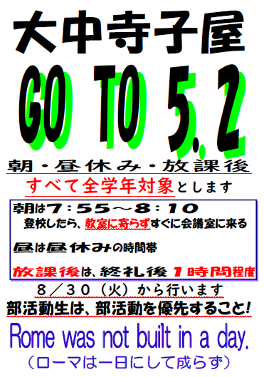今日から「寺子屋GOTO5.2」が始まりました。1・2年生から「放課後の寺子屋にも参加できるようにしてほしい」という要望があったため、朝・昼・放課後すべての寺子屋に全学年参加できるようにしました。ただし、部活動生は部活動を優先します。