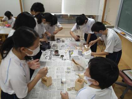 1年技術では、木工作品の仕上げにかかっています。ニスやペンキをぬって、きれいに仕上げていました。