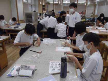 木材加工で作品を製作しています。グラインダーで磨いている生徒、釘を打っている生徒、塗装をしている生徒、進捗は様々ですが、みんな楽しんで取り組んでいます。