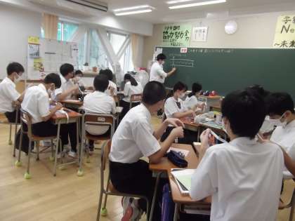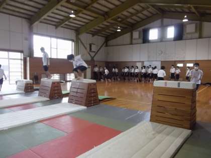 跳び箱の練習をしています。力量に応じ、自分に適した高さの跳び箱で挑戦しているので、どの生徒も意欲的に取り組んでいます。