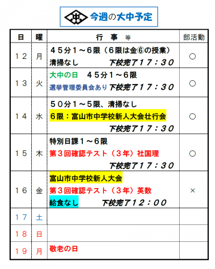 富山市中学校新人大会に向けて、今週は部活動強化週間とします。また、3年生は確認テストがあります。それぞれの成果が十分に発揮できることを願っています。