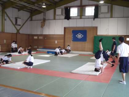 1−1は体育で、マット運動に取り組んでいます。今日は、三点倒立に挑戦していました。