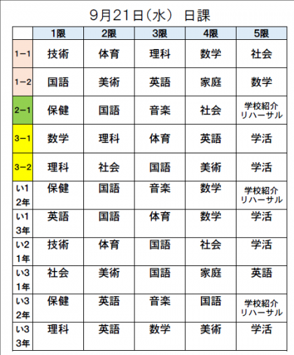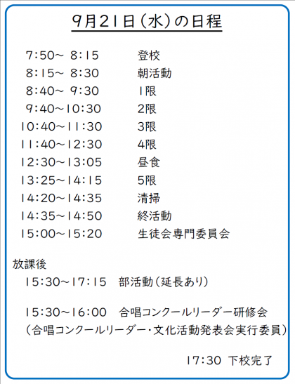 明日は、5時間授業と生徒会専門委員会(前期の活動の最終まとめ)を行います。