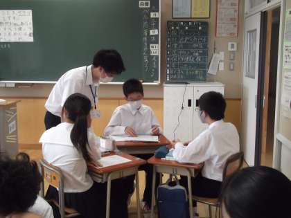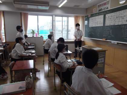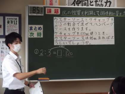 今日の1時限目、1−2で教育実習生の研究授業を行いました。「比の性質を利用して調味料の量を求めよう」を学習課題として、既習事項をもとに式の変形によって比例式の性質を導こうと、例題を解きながら授業が進められました。一人で考える時間、グループで考える時間、発表を聞いて自己の考えを推敲する時間が設けられ、生徒は意欲的に、そして楽しそうに授業に臨んでいました。