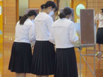 後期生徒会役員選挙の立会演説会、投票が行われました。演説会では、どの立候補者も、よりよい学校を築いていきたいという熱い思いを伝えていました。先輩方に引き続き、今後も活発な生徒による自治活動が期待される役員選挙でした。