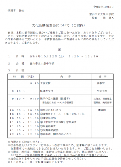 お子様を通して10月22日(土)の文化活動発表会の案内を配付しましたので、ご確認の程よろしくお願いいたします。