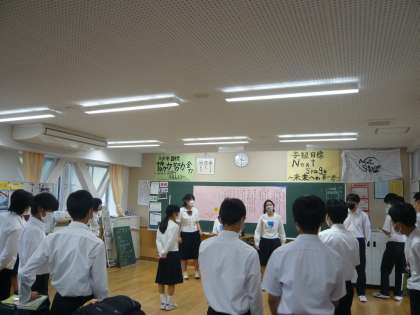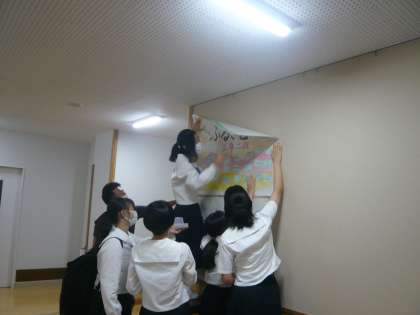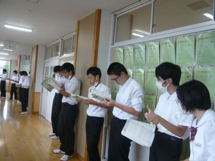 〈写真下〉文化活動発表会実行委員が、各クラスのスローガンを心を込めて掲示しています。