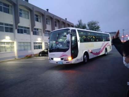 たった今、学校を出発しました。朝早かったのですが、みんな元気です。