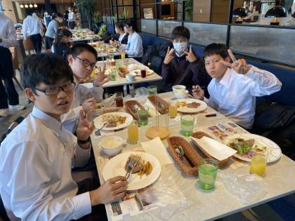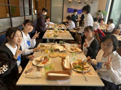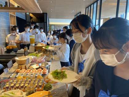 広島に到着し、シェラトングランドホテルでビュッフェスタイルの昼食を摂っています。見た目も舌も喜ぶ料理がずらりと並び、みんな大興奮です。