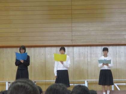 夏に行われた「中学生生活体験」意見発表、茶道部の発表、吹奏楽部の演奏を行いました。それぞれ制約のあるなかでの活動でしたが、それぞれが学び、感じたことをステージ上で堂々と発表しました。