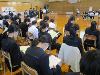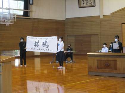 まずはじめに、執行部から生徒会スローガン案について説明がありました。「共鳴〜響け!一人一人の思い〜」という新たなスローガンには、共に高め合いながら成長してきたいという思い込められています。