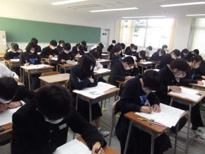 今日・明日と、県内中学校一斉に「中教研学力調査」が実施されます。今日の実施教科は、3学年とも国語・英語・理科です。1年生は、初めての学力調査のためか、教室内の雰囲気はいつも以上に緊張感が漂っていました。2年生は人数が多いので、多目的室での検査となっています。