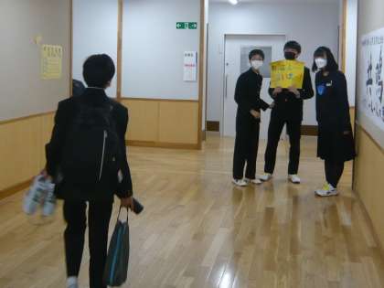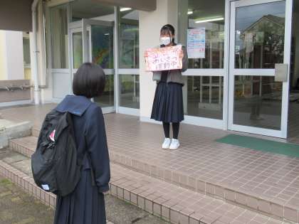 ボランティアを募り、生徒玄関や各フロアの廊下であいさつ運動をしました。朝から爽やかなあいさつが学校内に響き渡り、気持ち良く学校のスタートを切ることができました。