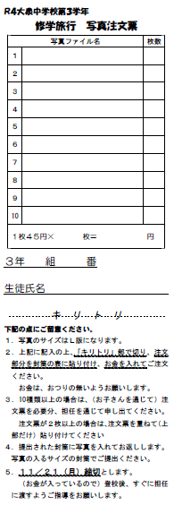 3年生には明日(11/15)の放課後1時間程度、3年生及び保護者の皆さんには11/16(水)から始まる進路相談会の時間帯に合わせ11/18(金)まで、14:30〜16:45に視聴覚室でサンプルを展示しますので、ご来校の際にご確認いただき、右の注文票でご注文ください。期間は短いのですが、11/21(月)までにご注文くださるようお願いします。