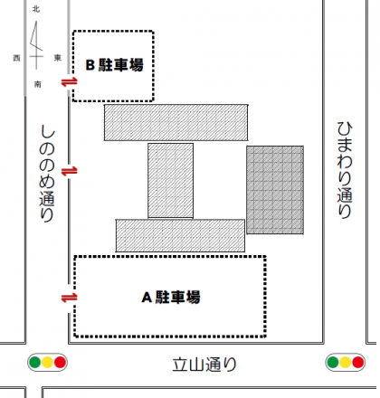 生徒の乗降及び待ち合わせは、A駐車場(立山通り沿い駐車場)及びB駐車場(配膳室前駐車場)でお願いします。