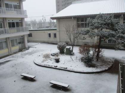 学校の中庭にも少しずつ雪が積もり始めています。