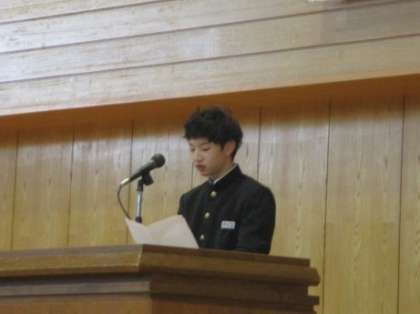 1年代表は、夏休みから努力を積み重ねた駅伝部での取り組みから得たことについて発表しました。チームメイトとともに切磋琢磨したことや当日の力を出し切った充実感から、来年度もたくさんの仲間とともに走る楽しみを分かち合いたいと語りました。