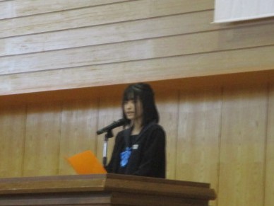 2年代表は、合唱コンクールや生徒会活動での経験について発表しました。人前に立って自分の意見を伝える機会から、積極的に行動することの大切さを知り、さらに挑戦していきたいとの思いを語りました。