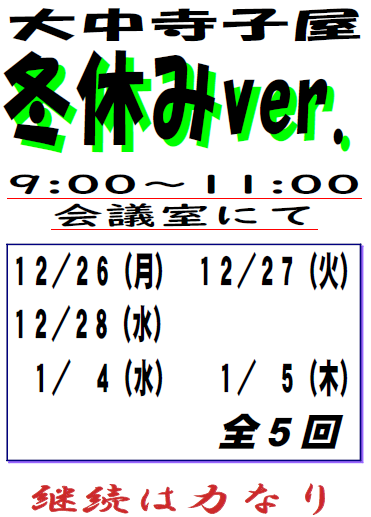 『継続は力なり』です。習い事や塾があったり、家族との行事があったりと、何かと忙しい年末・年始かもしれませんが、学習を「続けること」が自身の学力をUPさせる基になります。大中生の「学ぶ意欲」が続くよう、大中寺子屋を開きますので、ぜひ参加しましょう!