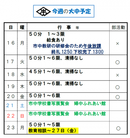 16日(月)は、市中教研の教員研修会のため、昼食(給食)のあと、13時00分下校完了となります。