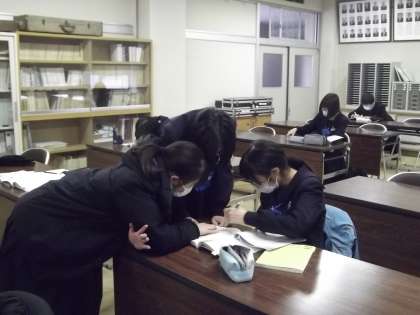 3年生中心に集まって、自主学習に励んでいます。数学の問題で悩んでいた生徒に対し、自然と仲間が集まり、一緒になって考える場面がありました。「三人寄れば文殊の知恵」ですね。
