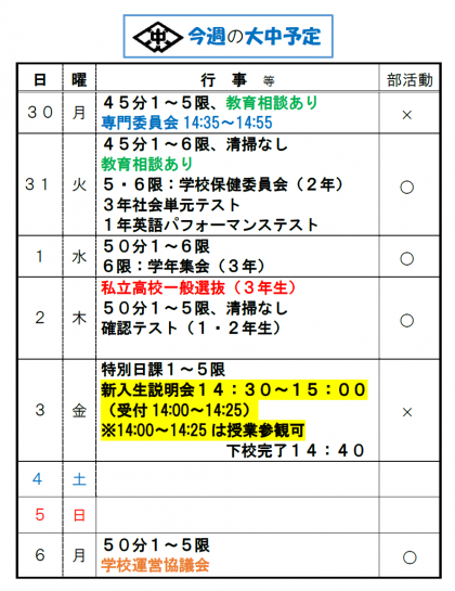 2月2日(木)は私立高校一般選抜の日です。3年生の皆さん、これまでの努力の成果を十分に発揮しましょう。なおこの日は、1・2年生は確認テストを行います。それぞれ2年後・1年後を想定して、大中生全員が顔晴る一日にしましょう。