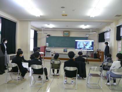 卒業を祝うスマイル交流のようすです。オンラインで他校の発表を聞きました。また、本校の発表では、心を込めて「旅立ちの日に」を歌ったり、卒業生へのメッセージを披露したりしました。