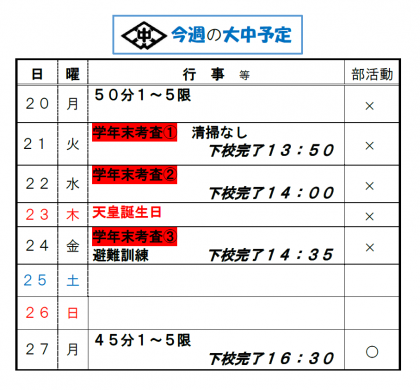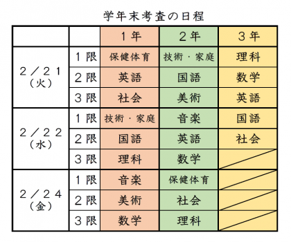 3年生は、中学校での学びを振り返る最後の考査となります。次のステージに向けて、必要な力を見極め、卒業までにできることを一つでも多く積み上げましょう。
