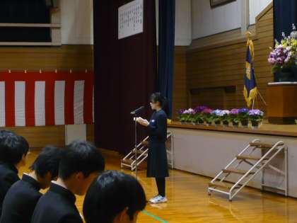 送辞では、生徒代表の松井さんが一言一言に思いを込めて、先輩への感謝の思いと旅立ちに際しての激励の言葉を語りました。