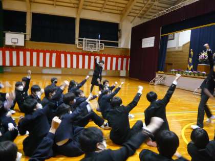 1・2年生は、会場の後始末です。3年生からバトンを受けた2年生は、全員で気合いを入れてから、片付けに入りました。