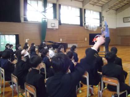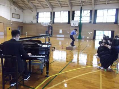 3学期、そして1年間を振り返る学年集会を行いましたが、会のはじめに先生方からのサプライズプレゼントがありました。ヴォーカル:清崎先生、ピアノ:頼成先生によるユニット「T’z」から、1年生の1年間のがんばりに対し歌のプレゼントです。いい雰囲気で、集会をスタートすることができました。