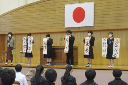 生徒会執行部のメンバーとともに、「3つの守る」を改めて確認しました。困ったことがあれば、抱え込まずに相談することや、相談機関についての紹介がありました。春休みのしおりで確認しておきましょう。