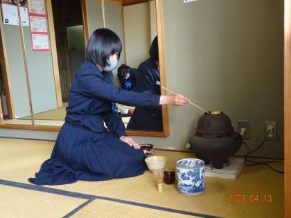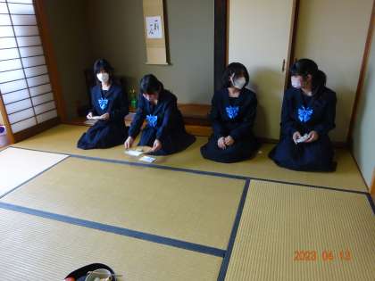 先輩の点てたお抹茶を、仮入部に訪れた新入生がいただいています。