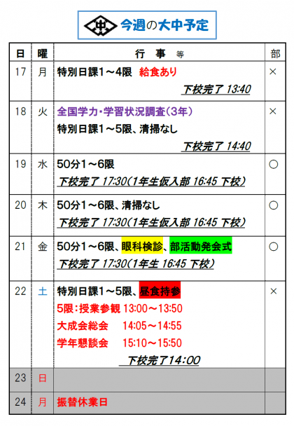 また、22日(土)の午後は、授業参観、大成会総会、学年懇談会があります。給食はありませんので、昼食の準備をお願いします。