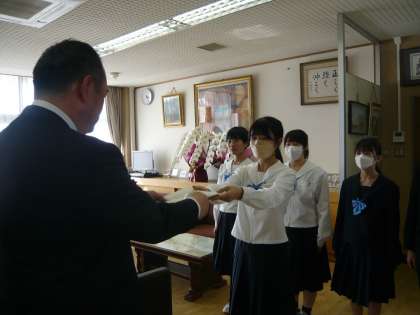 昨年度から執行部を中心に検討し、学級会等で審議してきた「生徒心得の見直し」について、本日の生徒総会で改定案が提案されました。放課後、執行部のメンバーが校長室を訪れ、校長に大中生の思いを代弁し、改定案を提出しました。