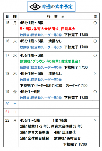 15日月曜日に、体育大会結団式と団別集会が行われます。また、今週の団活動は、全学年のリーダーが集まり、体育大会に向けて準備を進めていきます。