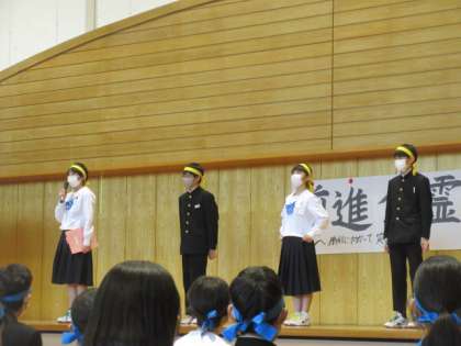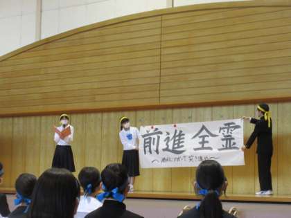 まず、始めに体育大会実行委員会から大会スローガン「前進全霊 〜勝利に向かって突き進め〜」についての説明、実行委員会メンバーの紹介がありました。