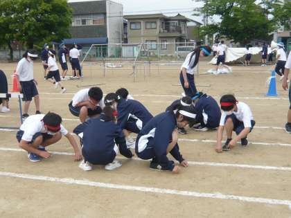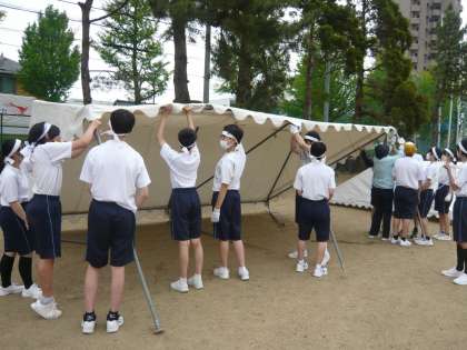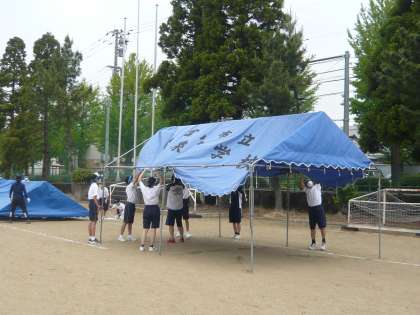 体育大会に向けて、準備を行いました。2・3年生はテントの組み立て(写真上・中)、1年生は土嚢運びと石拾いを行っています。(写真下)