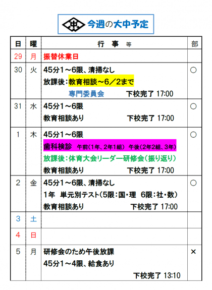 27(土)第71回体育大会には、たくさんの来賓、保護者の皆様に来校いただきました。ありがとうございました。今週から、教育相談が始まります。気にかかっていることや悩んでいることなど、じっくりと話をしましょう。
