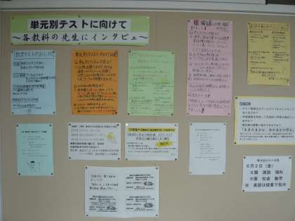 教科ごとに、単元のまとまりごとの確認テストを積み重ねています。1学年教室前廊下には、各教科担当者に、学習のアドバイスをインタビューした内容が掲示されています。