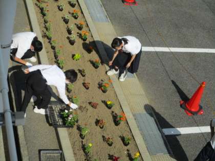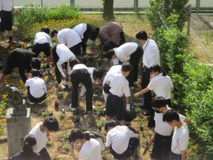 環境委員会は生徒玄関近くと校舎南側の花壇に花苗を植えました。