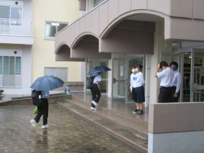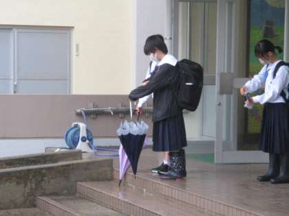 本校の生徒は登校時雨の場合は、玄関に入る前に傘の水滴をきれいに落としてから入ってくれます。特に指導しているわけではないのですが、1年生から3年生まで必ずしてくれます。何気ない行動ですが、これまでの経験や伝統のよいところだと思っています。