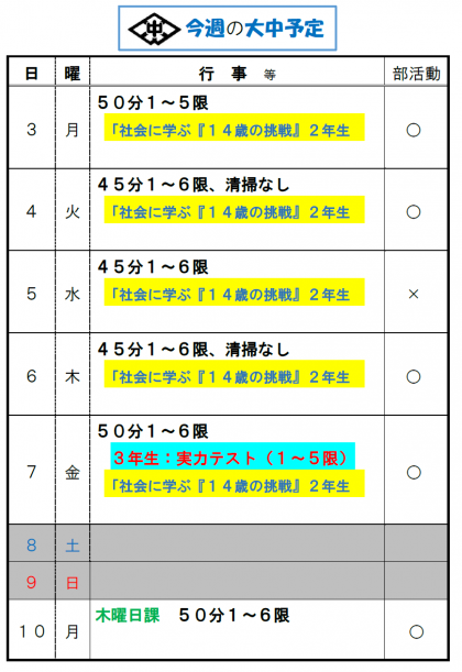 今週は、「社会に学ぶ『14の挑戦』」で、2年生が5日間、各事業所で活動を行います。また、7日(金)に3年生は、第1回実力テストがあります。計画的に学習を進めましょう。