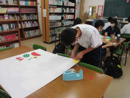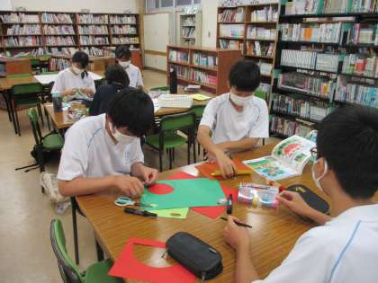 本日事業所が休みの生徒は、図書室にて「夏」をテーマにした飾りつけを製作しました。