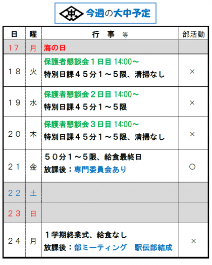 今週は18日(火)〜20日(木)まで、保護者懇談会があります。夏休みに向けて、机の中やロッカーにある荷物を持ち帰りましょう。今学期は、21日(金)が給食最終日になります。また、24日(月)は終業式です。